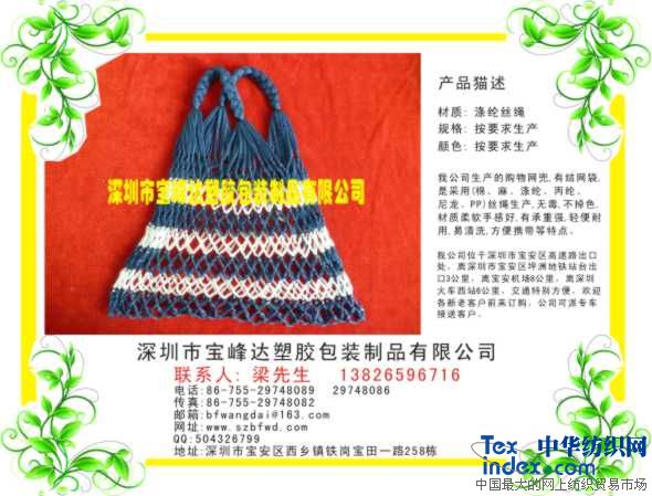 購物網兜,有結網袋,材料是采用:(滌綸繩,尼龍繩,丙綸繩, PP繩, 等…絲繩生產),無毒,不掉色,材質柔軟手感好,有承重強,輕便耐用,易清洗,方便攜帶等特點。