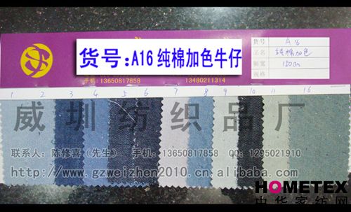 織物組織:平紋 幅寬:150cm 品名:滌棉牛仔 密度:64*47 水洗工藝:砂洗 貨號:A16純棉加色 重量:* 具體用途:休閑服、工作服、褲裝、時裝 別名:A16純棉加色 印染工藝:印花 成分及含量:75%棉,25%滌 主要用途:服裝用布 ======================================================================= 以上產品全部現貨供應,可隨時提供樣布卡和現貨,隨時發貨。所有產品全部是廠家直銷價,我們承諾:以超低利潤營銷,我 們只求銷售量。為保證您的利益,我司建議您在采購前先確認我們的品質樣與顏色樣后再拿大貨,期待與您的真誠合作。因產 品種類較多,具體參考未盡詳盡,如有需要,請您與我們聯系。 瑞豐紡織(中大旗艦店)坐落于國內最大的紡織面料產業中心—廣州中大,是一家專業銷售面料的廠家直銷商。主要經 營產品有:全棉凈色、仿記憶絲面料、全棉(TC)色織等,面料品種花達上千余種,所有產品全部現貨經營。 我們面料的品質來源于:1、采用國內外優質的原材料;2、使用精良的生產工藝和設備;3、完善的生產質量管理體系。我 們具有開發和創新品種的強烈意識和優越條件,并根據客戶需求與市場變化時時推出潮流面料。憑著多年的專業行業經驗,根 據客戶需求,不論客戶在全國任何地方,只要提供小樣,就可在一兩天時間內輕松獲得所需面料的信息。 批發說明供應商支持混批 。 ============================================================= 有意請加QQ:1295021910或電話聯系。 公司名稱:威圳紡織品廠 聯系人:陳修喜先生 手機:13650817858 網址:http://www.gzweizhen2010.cn.alibaba.com =============================================================