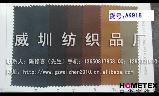 幅寬:140 別名:AK918 厚度:0.8 主要用途:鞋、箱包、服裝、手套 品種:PU革 貨號:AK918 品種:PU革 貨號:AK918 ============================================================= 以上產(chǎn)品全部現(xiàn)貨供應(yīng),可隨時提供樣布卡和現(xiàn)貨,隨時發(fā)貨。所有產(chǎn)品全部是廠家直銷價,我們承諾:以超低利潤營銷,我們只求銷售量。為保證您的利益,我司建議您在采購前先確認(rèn)我們的品質(zhì)樣與顏色樣后再拿大貨,期待與您的真誠合作。因產(chǎn)品種類較多,具體參考未盡詳盡,如有需要,請您與我們聯(lián)系。 瑞豐紡織(中大旗艦店)坐落于國內(nèi)最大的紡織面料產(chǎn)業(yè)中心—廣州中大,是一家專業(yè)銷售面料的廠家直銷商。主要經(jīng)營產(chǎn)品有:全棉凈色、仿記憶絲面料、全棉(TC)色織等,面料品種花達(dá)上千余種,所有產(chǎn)品全部現(xiàn)貨經(jīng)營。 我們面料的品質(zhì)來源于:1、采用國內(nèi)外優(yōu)質(zhì)的原材料;2、使用精良的生產(chǎn)工藝和設(shè)備;3、完善的生產(chǎn)質(zhì)量管理體系。我們具有開發(fā)和創(chuàng)新品種的強(qiáng)烈意識和優(yōu)越條件,并根據(jù)客戶需求與市場變化時時推出潮流面料。憑著多年的專業(yè)行業(yè)經(jīng)驗(yàn),根據(jù)客戶需求,不論客戶在全國任何地方,只要提供小樣,就可在一兩天時間內(nèi)輕松獲得所需面料的信息。 批發(fā)說明供應(yīng)商支持混批 。 ============================================================= 有意請加QQ:1295021910或電話聯(lián)系。 公司名稱:威圳紡織品廠 聯(lián)系人:陳修喜先生 手機(jī):13650817858 網(wǎng)址:http://www.gzweizhen2010.cn.alibaba.com =============================================================