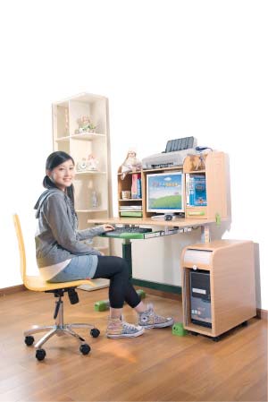 名家具展展出的“奪標”、“愛王”品牌家具的升降電腦桌,便是一款頗受歡迎的新品。這款奪標安全手搖或提拉升降計算機桌,配備有文具收納功能之鍵盤架、電線集線槽、四個桌腳微調高度等功能;而多功能書架則可在3秒內變身計算機架,還有可上下調整的層板、左右微調的隔書板、旋轉的文具盒、活動的讀書板、防傾倒的固定夾、多片CD架、高明流護眼燈具等不一而足,條理清晰而便捷使用,考慮地無微不至卻適合孩子的生理機能,不失為孩子們學習的一個好平臺。