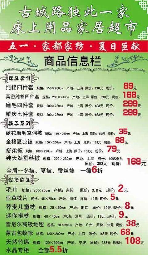 2009-4-20五一期間,南寧市古城路2-5號家都家紡?fù)瞥鱿盗写黉N活動,現(xiàn)在你就可以到那里以超低的價格抱回心愛的商品嘍。床品套件:純棉四件套:原價248元,現(xiàn)價89元;高密純棉四件套:原價398元,現(xiàn)價168元;磨毛四件套:原價698元,現(xiàn)價299元;婚慶七件套:原價638元,現(xiàn)價299元。被子系列:繡花磨毛空調(diào)被...[繼續(xù)閱讀] -