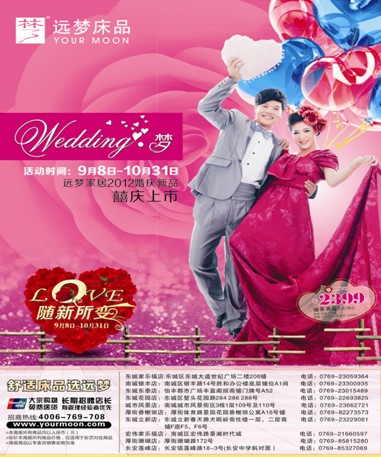 2012-10-12金秋十月,在這個(gè)碩果累累的季節(jié),愛(ài)情的花朵也結(jié)出了果實(shí),讓我們結(jié)婚吧,婚慶的選擇!遠(yuǎn)夢(mèng)家居新人們推出了《Wedding•夢(mèng)》婚慶產(chǎn)品推廣活動(dòng);顒(dòng)內(nèi)容:你新婚!我送禮!即日起到遠(yuǎn)夢(mèng)家居在東莞區(qū)大部分直營(yíng)店鋪購(gòu)買婚慶套件好禮送不停!蠶絲被、折扣券、婚紗藝術(shù)照還有豪華大禮包,隨你拿!活動(dòng)時(shí)間...[繼續(xù)閱讀] -